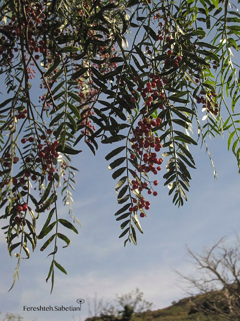| در راه برگشت به درختی رسیدیم که دانههای قرمز رنگ فلفل داشت که در شیرینیپزی استفاده میشوند. |